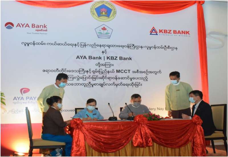 လူမှုဝန်ထမ်း၊ ကယ်ဆယ်ရေးနှင့် ပြန်လည်နေရာချထားရေး၀န်ကြီးဌာန လူမှုဝန်ထမ်းဦးစီးဌာနမှ ဆောင်ရွက်လျက်ရှိသည့် ကိုယ်ဝန်ဆောင်မိခင်များနှင့် ၎င်းတို့မှမွေးဖွားလာသော အသက်(၂)နှစ်အောက် ကလေးသူငယ်များအား ငွေကြေးထောက်ပံ့သည့် အစီအစဉ် (Maternal and Child Cash Transfer Program – MCCT) အား ဧရာဝတီတိုင်းဒေသကြီးနှင့် ရှမ်းပြည်နယ်တွင် ၂၀၂၀ ပြည့်နှစ်၊ စက်တင်ဘာလမှစတင်၍ ထောက်ပံ့နိုင်ရန်အတွက် ငွေကြေးလွှဲပြောင်းခြင်းဆိုင်ရာ ဝန်ဆောင်မှုပေးသည့် သဘောတူစာချုပ်လက်မှတ်ရေးထိုးခြင်း အခမ်းအနားကို ယနေ့နံနက်ပိုင်းတွင် နေပြည်တော်ရှိ M Gallery ဟိုတယ်တွင် ကျင်းပသည်။