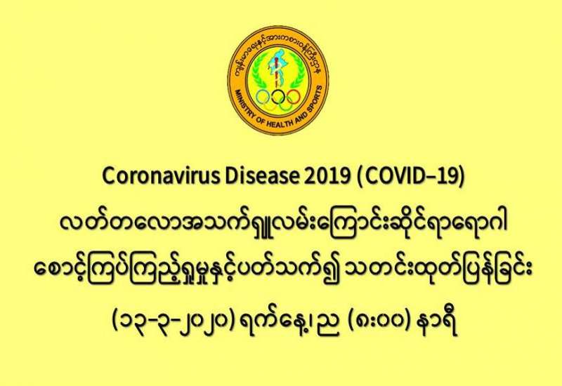၁။ ကျန်းမာရေးနှင့်အားကစားဝန်ကြီးဌာနသည် ကမ္ဘာ့နိုင်ငံများတွင် ကူးစက်ပျံ့နှံ့လျက်ရှိသည့် COVID-19 လတ်တလော အသက်ရှူလမ်းကြောင်းဆိုင်ရာ ရောဂါဖြစ်ပွားမှုဖြစ်စဉ်နှင့်ပတ်သက်၍ ရောဂါစောင့်ကြပ်ကြည့်ရှုခြင်း လုပ်ငန်းများအား အပြည်ပြည်ဆိုင်ရာ ဝင်ပေါက်၊ ထွက်ပေါက်ဂိတ် များတွင်လည်းကောင်း၊ ဆေးရုံအခြေပြုအဖြစ်လည်းကောင်း၊ ပြည်သူလူထု အခြေပြု စောင့်ကြပ် ကြည့်ရှုခြင်းလုပ်ငန်းများဖြင့်လည်းကောင်း၊ ပုဂ္ဂလိကဆေးရုံများနှင့် ပူးပေါင်း၍လည်းကောင်း ဆောင်ရွက် လျက်ရှိပါသည်။
