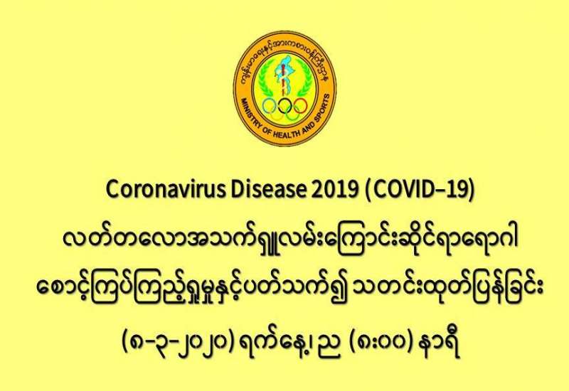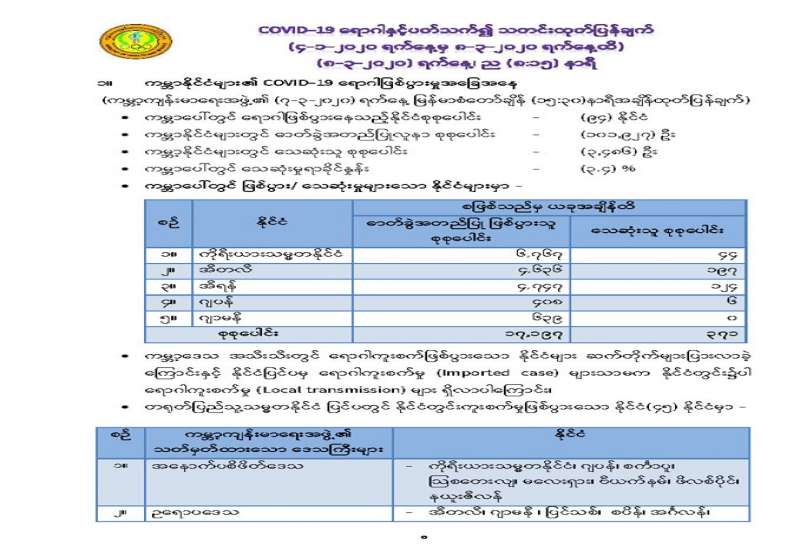 ၁။ ကျန်းမာရေးနှင့်အားကစားဝန်ကြီးဌာနသည် ကမ္ဘာ့နိုင်ငံများတွင် ကူးစက်ပျံ့နှံ့လျက်ရှိသည့် COVID-19 လတ်တလော အသက်ရှူလမ်းကြောင်းဆိုင်ရာ ရောဂါဖြစ်ပွားမှုဖြစ်စဉ်နှင့်ပတ်သက်၍ ရောဂါစောင့်ကြပ်ကြည့်ရှုခြင်း လုပ်ငန်းများအား အပြည်ပြည်ဆိုင်ရာ ဝင်ပေါက်၊ ထွက်ပေါက်ဂိတ် များတွင်လည်းကောင်း၊ ဆေးရုံအခြေပြုအဖြစ်လည်းကောင်း၊ ပြည်သူလူထု အခြေပြု စောင့်ကြပ် ကြည့်ရှုခြင်းလုပ်ငန်းများဖြင့်လည်းကောင်း၊ ပုဂ္ဂလိကဆေးရုံများနှင့် ပူးပေါင်း၍လည်းကောင်း ဆောင်ရွက် လျက်ရှိပါသည်။