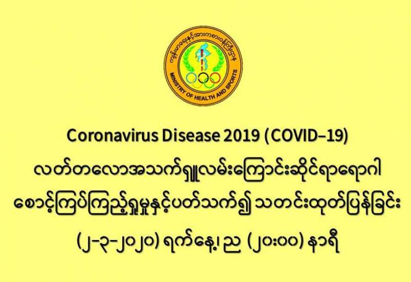 ၁။ ကျန်းမာရေးနှင့်အားကစားဝန်ကြီးဌာနသည် တရုတ်ပြည်သူ့သမ္မတနိုင်ငံနှင့် ကမ္ဘာ့နိုင်ငံ (၅၉) နိုင်ငံတွင် ကူးစက်ပျံ့နှံ့ လျက်ရှိသည့် COVID-19 ရောဂါဖြစ်ပွားမှုဖြစ်စဉ်နှင့်ပတ်သက်၍ ရောဂါစောင့်ကြပ်ကြည့်ရှုခြင်း လုပ်ငန်းများအား ဆောင်ရွက် လျက်ရှိရာ တွင် နိုင်ငံတကာ ကျန်းမာရေးဝန်ကြီးဌာနများနှင့်လည်းကောင်း၊ ကမ္ဘာ့ကျန်းမာရေးအဖွဲ့နှင့်လည်းကောင်း ချိတ်ဆက်၍ သတင်းပေးပို့ဖလှယ်ခြင်းများကို အချိန်နှင့်တစ်ပြေးညီ ဆောင်ရွက်လျက်ရှိပါသည်။
