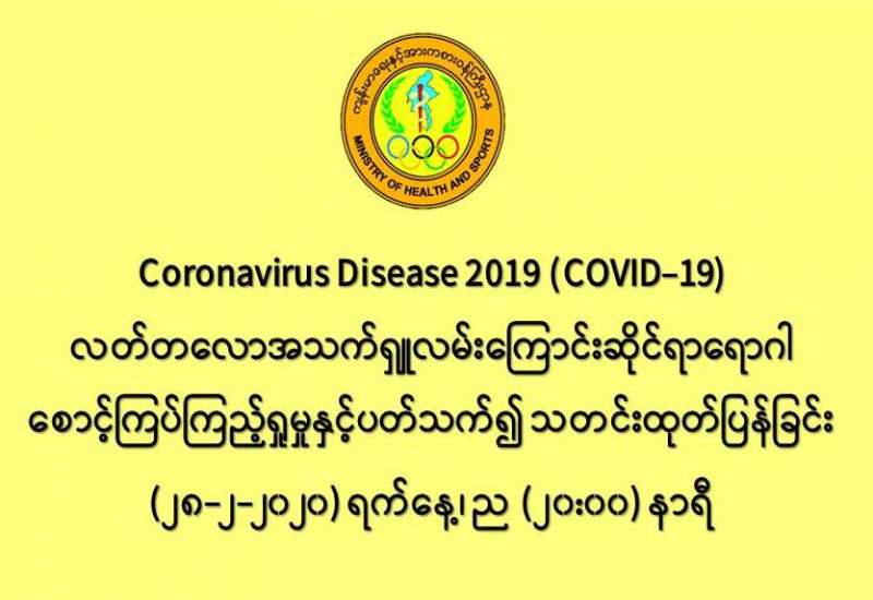 ၁။ ကျန်းမာရေးနှင့်အားကစားဝန်ကြီးဌာနသည် တရုတ်ပြည်သူ့သမ္မတနိုင်ငံနှင့် ကမ္ဘာ့နိုင်ငံအချို့တွင် ကူးစက်ပျံ့နှံ့လျက်ရှိသည့် COVID-19 လတ်တလောအသက်ရှူလမ်းကြောင်းဆိုင်ရာ ရောဂါ ဖြစ်ပွားမှုဖြစ်စဉ်နှင့်ပတ်သက်၍ ရောဂါစောင့်ကြပ်ကြည့်ရှုခြင်း လုပ်ငန်းများအား အပြည်ပြည်ဆိုင်ရာ ဝင်ပေါက်၊ ထွက်ပေါက်ဂိတ်များတွင်လည်းကောင်း၊ ဆေးရုံအခြေပြုအဖြစ်လည်းကောင်း၊ ပြည်သူ လူထုအခြေပြု စောင့်ကြပ်ကြည့်ရှုခြင်းလုပ်ငန်းများဖြင့်လည်းကောင်း၊ ပုဂ္ဂလိကဆေးရုံများနှင့် ပူးပေါင်း၍လည်းကောင်း ဆောင်ရွက်လျက်ရှိပါသည်။