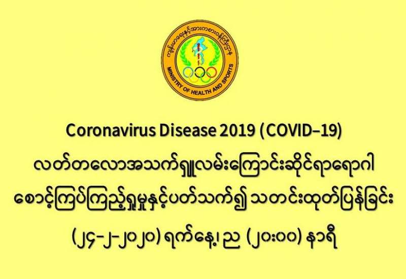 ၁။ ကျန်းမာရေးနှင့်အားကစားဝန်ကြီးဌာနသည် တရုတ်ပြည်သူ့သမ္မတနိုင်ငံနှင့် ကမ္ဘာ့နိုင်ငံအချို့ တွင် ကူးစက်ပျံ့နှံ့လျက်ရှိသည့် COVID-19 လတ်တလောအသက်ရှူလမ်းကြောင်းဆိုင်ရာ ရောဂါ ဖြစ်ပွားမှုဖြစ်စဉ်နှင့်ပတ်သက်၍ ရောဂါစောင့်ကြပ်ကြည့်ရှုခြင်း လုပ်ငန်းများအား အပြည်ပြည်ဆိုင်ရာ ဝင်ပေါက်၊ ထွက်ပေါက်ဂိတ်များတွင်လည်းကောင်း၊ ဆေးရုံအခြေပြုအဖြစ်လည်းကောင်း၊ ပြည်သူ လူထုအခြေပြု စောင့်ကြပ်ကြည့်ရှုခြင်းလုပ်ငန်းများဖြင့်လည်းကောင်း၊ ပုဂ္ဂလိကဆေးရုံများနှင့် ပူးပေါင်း၍လည်းကောင်း ဆောင်ရွက်လျက်ရှိပါသည်။