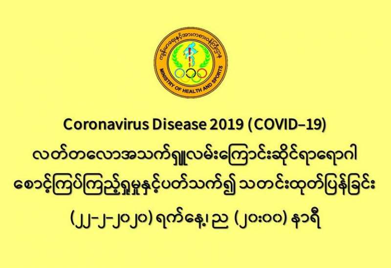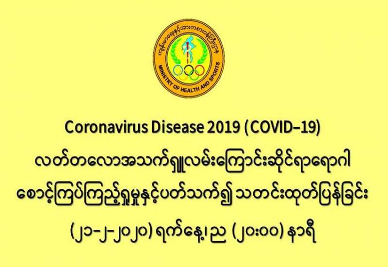 ၁။ ကျန်းမာရေးနှင့်အားကစားဝန်ကြီးဌာနသည် တရုတ်ပြည်သူ့သမ္မတနိုင်ငံနှင့် ကမ္ဘာ့နိုင်ငံအချို့တွင် ကူးစက်ပျံ့နှံ့လျက်ရှိသည့် COVID-19 လတ်တလော အသက်ရှူလမ်းကြောင်းဆိုင်ရာ ရောဂါ ဖြစ်ပွားမှုဖြစ်စဉ်နှင့် ပတ်သက်၍ ရောဂါစောင့်ကြပ်ကြည့်ရှုခြင်း လုပ်ငန်းများအား အပြည်ပြည် ဆိုင်ရာ ဝင်ပေါက်၊ ထွက်ပေါက်ဂိတ်များတွင်လည်းကောင်း၊ ဆေးရုံအခြေပြု အဖြစ်လည်းကောင်း၊ ပြည်သူလူထုအခြေပြု စောင့်ကြပ်ကြည့်ရှုခြင်း လုပ်ငန်းများဖြင့်လည်းကောင်း၊ ပုဂ္ဂလိက ဆေးရုံ များနှင့် ပူးပေါင်း၍လည်းကောင်း ဆောင်ရွက်လျက်ရှိပါသည်။