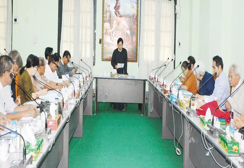 အစည်းအဝေးတွင် စာပေဗိမာန် စာမူဆုရ စိစစ်ရွေးချယ်ရေးအဖွဲ့ဥက္ကဋ္ဌ ဦးအုန်းမြင့် (မောင်ရင့်မာ-ကျောင်းကုန်း)က အမှာစကား ပြောကြားသည်။