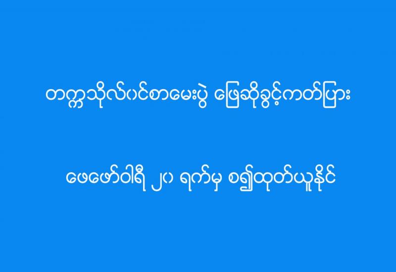 ၂၀၂၀ ပြည့်နှစ်၊ မတ်လ (၁၁) ရက်မှ (၂၀) ရက်အထိ ကျင်းပမည့် တက္ကသိုလ်ဝင်စာမေးပွဲကို ဖြေဆိုခွင့်လျှောက်ထားကြသော ကျောင်းသား၊ ကျောင်းသူများ တက္ကသိုလ်ဝင်စာမေးပွဲကို ဖြေဆိုခွင့်ကတ်ပြား ထုတ်ယူခြင်းနှင့်စပ်လျဉ်း၍ ပညာရေးဝန်ကြီးဌာန၊ မြန်မာနိုင်ငံစာစစ်ဦးစီးဌာနမှ ကြေညာချက်တစ်စောင် ထုတ်ပြန်လိုက်သည်။