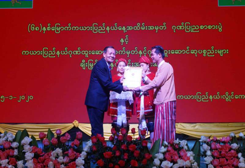 ဇန်နဝါရီလ(၁၅)ရက်နေ့တွင် ကျရောက်သည့် (၆၈)နှစ်မြောက် ကယားပြည်နယ်နေ့ အထိမ်း အမှတ်အဖြစ် ကယားပြည်နယ် ဂုဏ်ထူးဆောင် လက်မှတ်နှင့် ဂုဏ်ထူးဆောင်ဆု ပစ္စည်းချီးမြှင့် အပ်နှင်းခြင်းဆိုင်ရာ ဥပဒေ၊ နည်းဥပဒေများနှင့်အညီ ချီးမြှင့်သော ဂုဏ်ပြုဆုချီးမြှင့်အပ်နှင်းခြင်းနှင့် ဂုဏ်ပြုညစာစားပွဲ အခမ်းအနား အား ယမန်နေ့ ည ၆ နာရီအချိန်က လွိုင်ကော်မြို့၊ ပြည်နယ် ခန်းမ၌ ကျင်းပပြုလုပ်သည်။