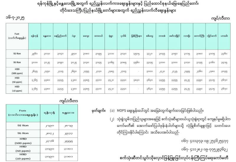 ရန်ကုန်မြို့နှင့် မန္တလေးမြို့အတွက် ရည်ညွှန်းလက်ကားဈေးနှုန်းများနှင့် ပြည်ထောင်စုနယ်မြေ နေပြည်တော်၊ တိုင်းဒေသကြီး/ပြည်နယ် မြို့တော်များအတွက် ရည်ညွှန်းလက်လီဈေးနှုန်းများ