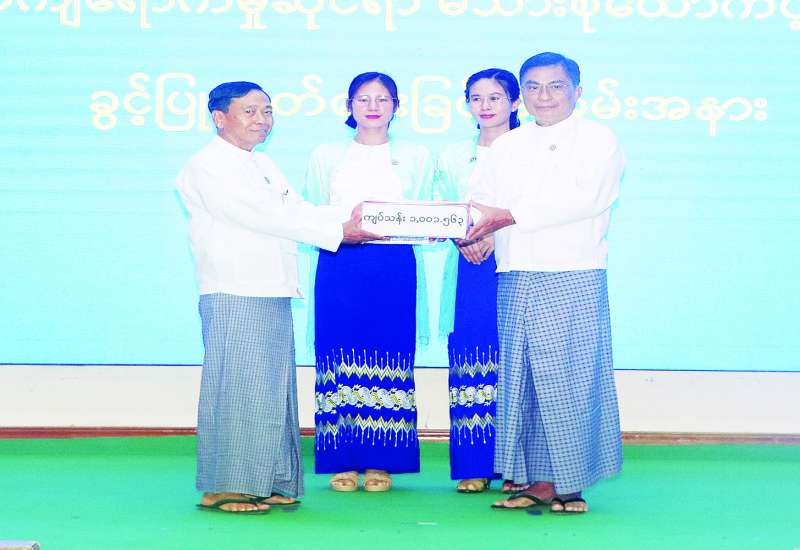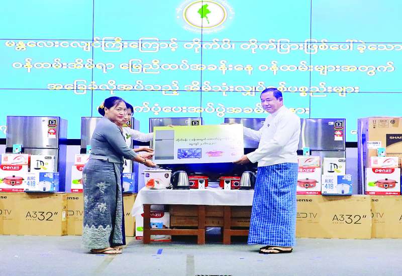ငလျင်ဒဏ်ကြောင့် ပြည်ထောင်စုနယ်မြေ နေပြည်တော်တွင် တိုက်ပိ၊ တိုက်ပြားဖြစ်ပေါ်ခဲ့သော ဝန်ကြီးဌာန၊ အဖွဲ့အစည်း ၂၅ ခုမှ ဝန်ထမ်းအိမ်ရာ မြေညီထပ်အခန်း ၄၉၉ ခန်းအတွက် အခြေခံလိုအပ်သည့် မီးဖိုချောင်သုံးနှင့် အိမ်သုံးလျှပ်စစ်ပစ္စည်း ခြောက်မျိုးထောက်ပံ့ပေးအပ်ပွဲကို ယနေ့နံနက်ပိုင်းတွင် အမျိုးသားသဘာဝဘေးအန္တရာယ်ဆိုင်ရာ စီမံခန့်ခွဲမှုကော်မတီဒုတိယဥက္ကဋ္ဌ ပြည်ထောင်စုဝန်ကြီးများဦးဆောင်၍ လူမှုဝန်ထမ်း၊ ကယ်ဆယ်ရေးနှင့် ပြန်လည်နေရာချထားရေးဝန်ကြီးဌာန စုပေါင်းခန်းမ၌ ကျင်းပသည်။