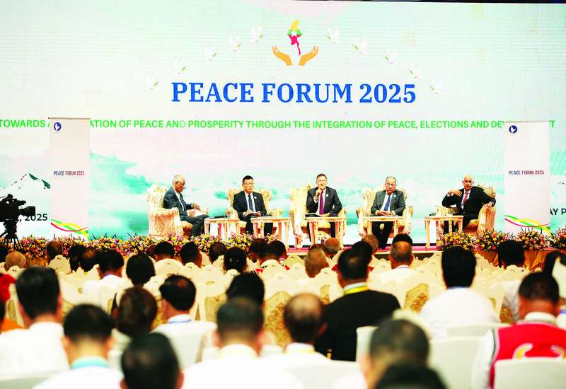 “ငြိမ်းချမ်းရေး၊ ရွေးကောက်ပွဲနှင့်ဖက်ဒရယ်စနစ်တို့ပေါင်းစည်းခြင်းမှ အေးချမ်းသာယာဝပြောသည့် နိုင်ငံတော်သစ်ဆီသို့” သုံးသပ်ဆွေးနွေးပွဲငြိမ်းချမ်းရေးဖိုရမ် - Peace Forum 2025 ကို ယနေ့နံနက်ပိုင်းတွင် နေပြည်တော်ရှိ မင်္ဂလာသီရိဟိုတယ်ခန်းမ၌ ကျင်းပသည်။