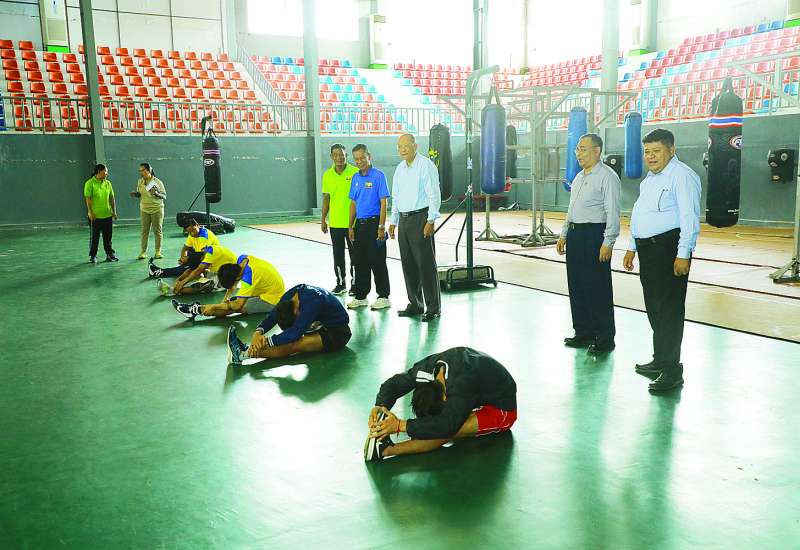 အားကစားနှင့်လူငယ်ရေးရာဝန်ကြီးဌာန ပြည်ထောင်စုဝန်ကြီး Jeng Phang နော်တောင်သည် ဒုတိယဝန်ကြီး ဦးထိန်လင်း၊ အားကစားနှင့်ကာယပညာဦးစီးဌာန ညွှန်ကြားရေးမှူးချုပ်၊ တာဝန်ရှိသူများနှင့်အတူ ယနေ့နံနက်ပိုင်းတွင် (၃၃) ကြိမ်မြောက် အရှေ့တောင်အာရှအားကစားပြိုင်ပွဲတွင် ပါဝင်ယှဉ်ပြိုင်မည့် နေပြည်တော်၌ စခန်းဝင်လေ့ကျင့်လျက်ရှိသော အားကစားအဖွဲ့များ၏ လေ့ကျင့်နေမှုများကို လိုက်လံကြည့်ရှုအားပေးသည်။