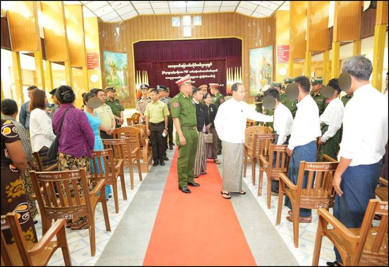 တိုင်းရင်းသားလက်နက်ကိုင်အဖွဲ့ နယ်မြေများအတွင်း သင်တန်းများတက်ရောက်ခဲ့ပြီး ပြစ်မှုကျူးလွန်ခြင်းမရှိခဲ့သည့် ဥပဒေဘောင်အတွင်းဝင်ရောက်လာသော PDF အမည်ခံ အဖွဲ့ဝင်များကို ပြန်လည်ကြိုဆိုလက်ခံ၍ မိဘအုပ်ထိန်းသူများထံ လွှဲပြောင်းပေးအပ်ခြင်းကို ယနေ့နံနက်ပိုင်းတွင် အနောက်မြောက်တိုင်းစစ်ဌာနချုပ် ဇေယျာသီရိခန်းမ၌ ပြုလုပ်ရာ တိုင်းဒေသကြီးဝန်ကြီးချုပ် ဦးမြတ်ကျော်၊ တိုင်းမှူးဗိုလ်မှူးချုပ်မျိုးမင်းထွေးနှင့် ဌာနဆိုင်ရာတာဝန်ရှိသူများ၊ ဥပဒေဘောင်အတွင်းဝင်ရောက်လာသော PDF အဖွဲ့ဝင်များနှင့် ၎င်းတို့၏ မိဘအုပ်ထိန်းသူများ တက်ရောက်ကြသည်။