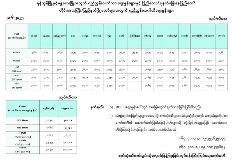 ရန်ကုန်မြို့နှင့် မန္တလေးမြို့အတွက် ရည်ညွှန်းလက်ကားဈေးနှုန်းများနှင့် ပြည်ထောင်စုနယ်မြေ နေပြည်တော်၊ တိုင်းဒေသကြီး/ ပြည်နယ် မြို့တော်များအတွက် ရည်ညွှန်းလက်လီဈေးနှုန်းများ