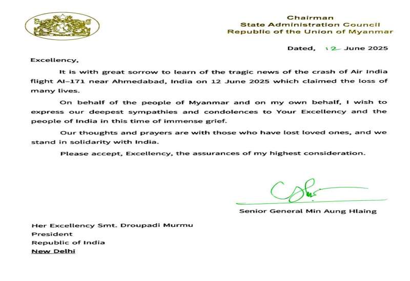 နိုင်ငံတော်စီမံအုပ်ချုပ်ရေးကောင်စီဥက္ကဋ္ဌ နိုင်ငံတော်ဝန်ကြီးချုပ် ဗိုလ်ချုပ်မှူးကြီး မင်းအောင်လှိုင်သည် ယနေ့တွင် အိန္ဒိယသမ္မတနိုင်ငံ အမီဒါဘတ်မြို့အနီး၌ အိန္ဒိယလေကြောင်း AI-171 ပျက်ကျခဲ့မှုကြောင့် လူပေါင်းများစွာ အသက်ဆုံးရှုံးခဲ့ရမှုများအတွက် ဝမ်းနည်းကြောင်းသဝဏ်လွှာကို အိန္ဒိယသမ္မတ နိုင်ငံသမ္မတ ရှရီမတီ ဒရောပါဒီ မာမူထံသို့ ပေးပို့သည်။