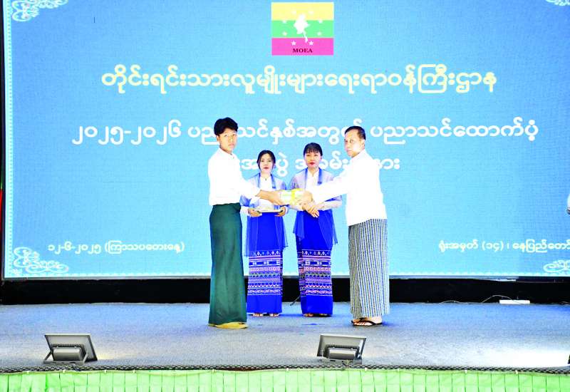 တိုင်းရင်းသားလူမျိုးများရေးရာဝန်ကြီးဌာန ၂၀၂၅-၂၀၂၆ ပညာသင်နှစ်အတွက် ပညာသင်ထောက်ပံ့ကြေးနှင့် စာရေးကိရိယာများ ပေးအပ်ခြင်းအခမ်းအနားကို ယနေ့နံနက်ပိုင်းတွင် အဆိုပါဝန်ကြီးဌာန အစည်းအဝေးခန်းမ၌ကျင်းပရာ ပြည်ထောင်စုဝန်ကြီး ခွန်သန့်ဇော်ထူး၊ ဒုတိယဝန်ကြီး ဦးဇော်အေးမောင်၊ အမြဲတမ်းအတွင်းဝန်၊ ဌာနဆိုင်ရာတာဝန်ရှိသူများ၊ အရာထမ်းများနှင့် ကျောင်းသား ကျောင်းသူများ တက်ရောက်ကြပြီး တိုင်းဒေသကြီး၊ ပြည်နယ်ညွှန်ကြားရေးမှူးရုံးများမှ အရာထမ်း၊ အမှုထမ်းများနှင့် ကျောင်းသား ကျောင်းသူများက အွန်လိုင်းဖြင့် တက်ရောက်သည်။