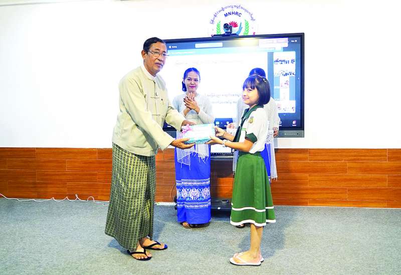 မြန်မာနိုင်ငံ အမျိုးသားလူ့အခွင့်အရေးကော်မရှင်ရုံးဝန်ထမ်းများ၏ အခြေခံပညာကျောင်းနေအရွယ် သားသမီးများ ဒုတိယအကြိမ် ပညာသင်စရိတ်ထောက်ပံ့ပေးအပ်သည့် အခမ်းအနားကို ယနေ့မွန်းလွဲပိုင်းတွင် ကော်မရှင်ရုံး၌ ပြုလုပ်ရာ ကော်မရှင်ဥက္ကဋ္ဌ၊ ကော်မရှင်အဖွဲ့ဝင်များ၊ ကော်မရှင်ရုံးဝန်ထမ်းများနှင့် ဝန်ထမ်းများ၏ အခြေခံပညာကျောင်းနေအရွယ်သားသမီးများ တက်ရောက်ကြသည်။