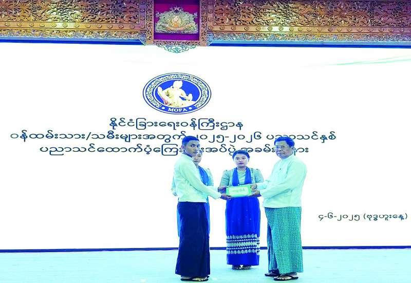 နိုင်ငံခြားရေးဝန်ကြီးဌာနဝန်ထမ်းသားသမီးများအား ၂၀၂၅-၂၀၂၆ ပညာသင်နှစ်အတွက်ပညာသင် ထောက်ပံ့ကြေးပေးအပ်ခြင်းအခမ်းအနားကို ယနေ့နံနက် ၁၀ နာရီခွဲတွင် နိုင်ငံခြားရေးဝန်ကြီးဌာန ရုံးအမှတ် (၉) လောကနတ်ခန်းမ၌ကျင်းပ ရာဒုတိယဝန်ကြီးချုပ်နှင့် နိုင်ငံခြားရေးဝန်ကြီးဌာန ပြည်ထောင်စုဝန်ကြီး ဦးသန်းဆွေ တက်ရောက်အမှာစကားပြောကြားသည်။