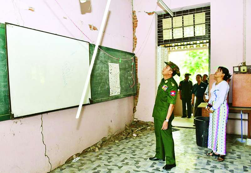 နိုင်ငံတော်စီမံအုပ်ချုပ်ရေးကောင်စီအဖွဲ့ဝင် နယ်စပ်ရေးရာဝန်ကြီးဌာန ပြည်ထောင်စုဝန်ကြီး ဒုတိယဗိုလ်ချုပ်ကြီး ရာပြည့်သည် ဒုတိယဝန်ကြီး ဗိုလ်ချုပ်ဖြိုးသန့်၊ အမြဲတမ်းအတွင်းဝန်၊ ဌာနဆိုင်ရာ တာဝန်ရှိသူများနှင့်အတူ ယနေ့နံနက်ပိုင်းတွင် ငလျင်ဒဏ်ထိခိုက်ခံစားခဲ့ရသည့် ဝန်ထမ်းများနှင့် ဝန်ထမ်းမိသားစုများအား ရာနှုန်းပြည့် တည်ဆောက်ပြီးစီးခဲ့သည့် ယာယီဘာရှာအဆောက်အအုံများသို့ အပြီးသတ်ပြောင်းရွှေ့နေရာချထားမှုကို ကြည့်ရှုစစ်ဆေးသည်။