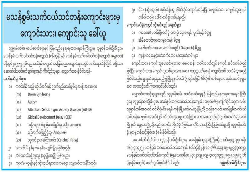 မသန်စွမ်းသက်ငယ်သင်တန်းကျောင်းများမှ ကျောင်းသား၊ ကျောင်းသူ ခေါ်ယူ