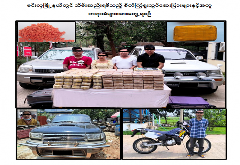 လုံခြုံရေးတပ်ဖွဲ့ဝင်များပါဝင်သော ပူးပေါင်းအဖွဲ့သည် မေလ ၉ ရက်နေ့ မွန်းလွဲ ၂ နာရီခွဲအချိန် မင်းလှမြို့နယ်၊ ပုသိမ်-မုံရွာသွားကားလမ်း၊ ရှမ်းတဲကျေးရွာအနီးတွင် သတင်းအရစောင့်ဆိုင်းနေစဉ် မင်းလှဘက်မှ မင်းတုန်းဘက်သို့ ပြည့်ဖြိုးကျော်မောင်းနှင်ပြီး မဇင်ဇင်ဝေ(ခ)ဇင်ဇင်မာ လိုက်ပါလာသည့် X-TRAIL မော်တော်ယာဉ်နှင့် ရန်နိုင်ထွဋ် မောင်းနှင်ပြီး တင်လတ်လိုက်ပါလာသည့် SURF မော်တော်ယာဉ်တို့ကို ရှာဖွေခဲ့ရာ အဆိုပါယာဉ် ၂ စီးပေါ်မှ စိတ်ကြွရူးသွပ်ဆေးပြား ၂၁ ဒသမ ၈ သိန်း ဖမ်းဆီးရမိခဲ့ပြီး ၎င်းတို့၏ ဖော်ထုတ်ချက်အရ ပျဉ်းမနားမြို့မှ မကွေးတိုင်းဒေသကြီး၊ မင်းတုန်းမြို့နယ်သို့ စိတ်ကြွရူးသွပ်ဆေးပြားများ သယ်ဆောင်ခိုင်းသူ မနန်း(ခ)မျိုးသီရိကျော်နှင့် မျိုးဇော်အောင်တို့ ၂ ဦး၏ မူးယစ်ဆေးဝါးသယ်ဆောင်ရာ၌ အသုံးပြုခဲ့သည့် TOYOTA HILUX SURF မော်တော်ယာဉ်တစ်စီးအား ပျဉ်းမနားမြို့၊