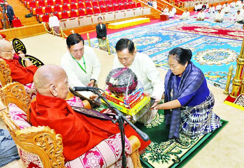 ၁၃၈၇ ခုနှစ် ကဆုန်လပြည့်ဗုဒ္ဓနေ့ အထိမ်းအမှတ်အဖြစ် ဆင်ယင်ကျင်းပပူဇော်သည့် မဟာမင်္ဂလာအခမ်းအနားသို့ ကြွရောက်တော်မူကြသည့် ဆရာတော်ကြီးများအား လှူဖွယ်ပစ္စည်းများနှင့် နေ့ဆွမ်းဆက်ကပ်လှူဒါန်းခြင်း မင်္ဂလာအခမ်းအနားကို ယနေ့နံနက်ပိုင်းတွင် နေပြည်တော်မာရဝိဇယ ဗုဒ္ဓဥယျာဉ်တော် ပရိဝုဏ်အတွင်းရှိ အဂ္ဂါဓိပတိသာသနာ့ ဗိမာန်တော်ကြီး၌ကျင်းပရာ ပြည်ထောင်စုသမ္မတ မြန်မာနိုင်ငံတော်၊ နိုင်ငံတော်စီမံအုပ်ချုပ်ရေးကောင်စီ ကဆုန်လပြည့်ဗုဒ္ဓနေ့ဆိုင်ရာ မဟာမင်္ဂလာ အခမ်းအနားများကျင်းပရေး နာယကအဖွဲ့ဥက္ကဋ္ဌ နိုင်ငံတော်စီမံအုပ်ချုပ်ရေးကောင်စီ ဒုတိယဥက္ကဋ္ဌ ဒုတိယဝန်ကြီးချုပ် ဒုတိယဗိုလ်ချုပ်မှူးကြီးစိုးဝင်းနှင့်ဇနီး ဒေါ်သန်းသန်းနွယ်တို့က လှူဖွယ်ပစ္စည်းများနှင့် နေ့ဆွမ်းဆက်ကပ်လှူဒါန်းသည်။