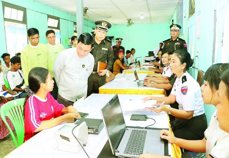 လူဝင်မှုကြီးကြပ်ရေးနှင့်ပြည်သူ့အင်အားဝန်ကြီးဌာန ပြည်ထောင်စုဝန်ကြီး ဦးမြင့်ကြိုင်သည် တာဝန်ရှိသူများနှင့်အတူ ယနေ့နံနက်ပိုင်းတွင် ဧရာဝတီတိုင်းဒေသကြီး ကျောင်းကုန်းမြို့နယ်ရှိ လူဝင်မှုကြီးကြပ်ရေးနှင့် ပြည်သူ့အင်အားဝန်ကြီးဌာန ကျောင်းကုန်းမြို့နယ် ဦးစီးမှူးရုံးတွင် ဝန်ထမ်းများက နိုင်ငံသားစိစစ်ရေးကတ်ရရှိပြီးသူများအား e-ID စနစ်ဖြင့် ကိုယ်ရေးအချက်အလက် (Biographic)နှင့် ဇီဝဆိုင်ရာအချက်အလက် (Biometric) ကောက်ယူကာ ဂဏန်း ၁၀ လုံးပါ(Unique ID) နံပါတ်ထုတ်ပေးနေမှုကို ကြည့်ရှုအားပေးသည်။