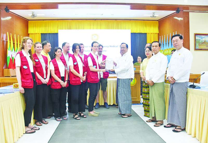 အမျိုးသားသဘာဝဘေးအန္တရာယ် စီမံခန့်ခွဲမှုကော်မတီဥက္ကဋ္ဌ၏ကိုယ်စား ကျန်းမာရေးဝန်ကြီးဌာန ပြည်ထောင်စုဝန်ကြီး ဒေါက်တာသက်ခိုင်ဝင်းက မြန်မာနိုင်ငံတွင် ကျန်းမာရေးစောင့်ရှောက်မှုလုပ်ငန်းများပြီးဆုံး၍ ပြန်လည်ထွက်ခွာမည့် ဂျာမနီနိုင်ငံ အရေးပေါ်ဆေးအဖွဲ့အား ဂုဏ်ပြုနှုတ်ဆက်ပွဲအခမ်းအနားကို ယနေ့နံနက်ပိုင်းတွင် ကျန်းမာရေးဝန်ကြီးဌာန ရုံးအမှတ် (၄) အစည်းအဝေးခန်းမ၌ ကျင်းပသည်။