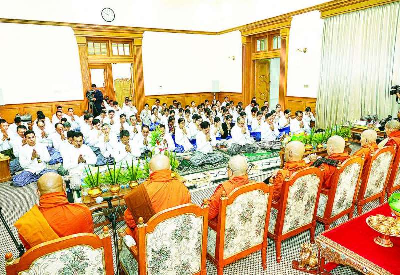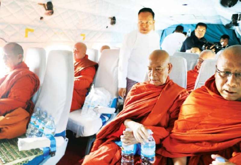ပြည်သူများ ဘေးအန္တရာယ်အပေါင်း ကင်းရှင်းပြီး ငြိမ်းချမ်းသာယာစေရေးအတွက် ယနေ့နံနက် ၇ နာရီတွင် ဆရာတော်ကြီးများက ပြည်ထောင်စုနယ်မြေ နေပြည်တော်ဝေဟင်၌ ရဟတ်ယာဉ်ဖြင့် အန္တရာယ်ကင်းပရိတ်တရားတော်များရွတ်ဖတ်ပြီး ပရိတ်ရေများ ပက်ဖျန်းတော်မူကြသည်။