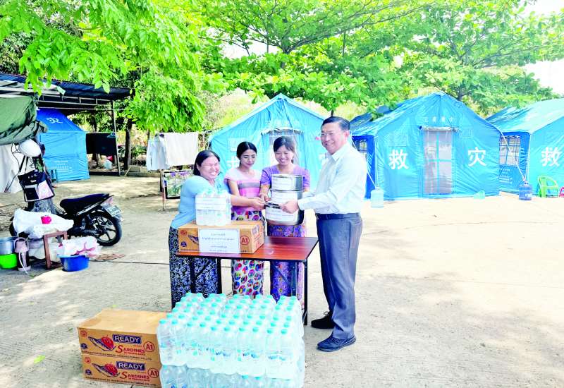 ပြည်ထောင်စုဝန်ကြီး ဦးမင်းနောင်နှင့် တာဝန်ရှိသူများသည် မန္တလေးငလျင်ကြီးကြောင့် ထိခိုက်ခံစား ခဲ့ရသည့် စိုက်ပျိုးရေး၊ မွေးမြူရေးနှင့်ဆည်မြောင်းဝန်ကြီးဌာနအောက်ရှိ ဦးစီးဌာနများမှ ဒေသအသီးသီးတွင် တာဝန်ထမ်းဆောင်လျက်ရှိသော ဝန်ထမ်းများအား သက်ဆိုင်ရာဒေသအရောက် တွေ့ဆုံအားပေးခြင်း၊ စားသောက်ဖွယ်ရာများ ထောက်ပံ့ပေးခြင်းများ ဆောင်ရွက်လျက်ရှိရာ ဧပြီ ၁၂ ရက် နံနက်ပိုင်းတွင် မိတ္ထီလာခရိုင်နှင့်မြို့နယ်မှ အမှုထမ်း၊ အရာထမ်းများအား မိတ္ထီလာမြို့နယ် စိုက်ပျိုးရေးဦးစီးဌာန ဥယျာဉ်သီးနှံခြံ၌ သွားရောက်တွေ့ဆုံ၍ အားပေးစကား ပြောကြားပြီး စားသောက်ဖွယ်ရာများနှင့် ထောက်ပံ့ငွေများ ပေးအပ်သည်။