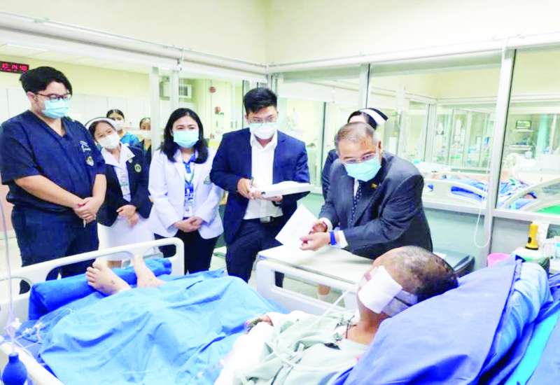 မတ် ၂၈ ရက်က ထိုင်းနိုင်ငံ ဗန်ကောက်မြို့ Khet Chatuchak နယ်မြေ၌ မြေငလျင်လှုပ်ခတ်၍ ဆောက်လုပ်ဆဲ အဆောက်အအုံ ပြိုကျပျက်စီးမှုကြောင့် ထိခိုက်ဒဏ်ရာရရှိ၍ ဆေးကုသမှုခံယူနေသော မြန်မာအလုပ်သမားများအား နိုင်ငံတော်အကြီးအကဲ၏ လမ်းညွှန်ချက်နှင့်အညီ ထိုင်းနိုင်ငံဆိုင်ရာ မြန်မာသံအမတ်ကြီးက ဧပြီ ၉ ရက်တွင် သွားရောက် အားပေးစကား ပြောကြားပြီး ထောက်ပံ့ငွေပေးအပ်ခဲ့ကြောင်း သိရသည်။