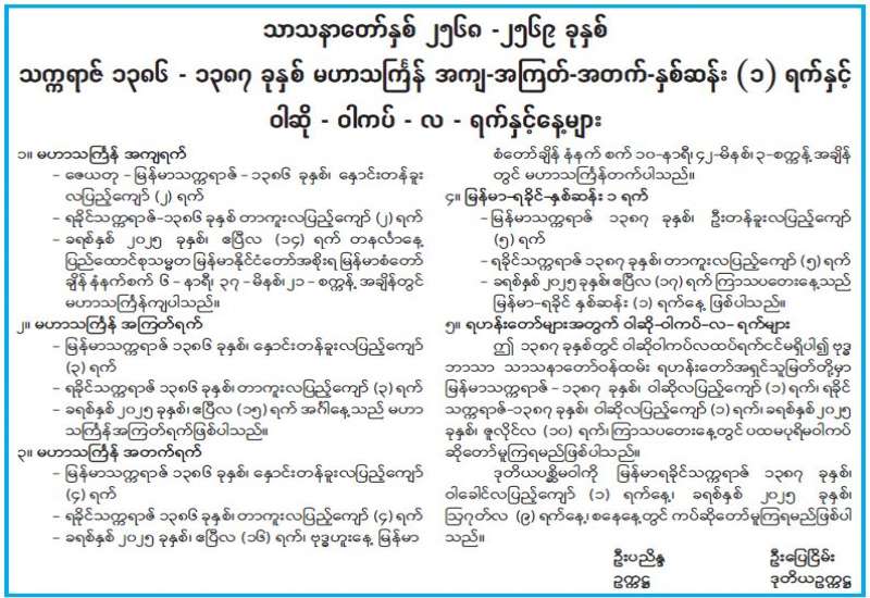 ၂၀၂၄-၂၀၂၅ ပညာသင်နှစ် တက္ကသိုလ်ဝင်စာမေးပွဲကို မတ် ၁၇ ရက်တွင် စတင်ကျင်းပလျက်ရှိရာ ယနေ့တွင် စတုတ္ထနေ့အဖြစ် ဓာတုဗေဒဘာသာရပ်နှင့် ပထဝီဝင်ဘာသာရပ်တို့ကို တိုင်းဒေသကြီးနှင့် ပြည်နယ်အသီးသီးရှိ အခြေခံပညာအထက်တန်းကျောင်းများ၌ ကျောင်းသား ကျောင်းသူများ ဝင်ရောက်ဖြေဆိုလျက်ရှိသည်။
