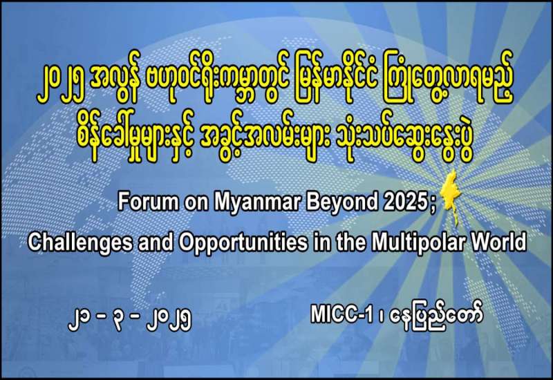 ပြန်ကြားရေးဝန်ကြီးဌာနက ကြီးမှူး၍ မြန်မာ့ပုံရိပ်ဖော်ညွှန်းရေးအဖွဲ့ (Myanmar Narrative Think Tank) က စီစဉ်ကျင်းပသော “၂၀၂၅ အလွန် ဗဟုဝင်ရိုးကမ္ဘာတွင် မြန်မာနိုင်ငံ ကြုံတွေ့လာရမည့် စိန်ခေါ်မှုများနှင့် အခွင့်အလမ်းများ” သုံးသပ်ဆွေးနွေးပွဲ (Forum on Myanmar Beyond 2025; Challenges and Opportunities in the Multipolar World) ကို ၂၀၂၅ ခုနှစ်၊ မတ်လ (၂၁) ရက်နေ့တွင် နေပြည်တော်ရှိ မြန်မာအပြည်ပြည်ဆိုင်ရာကွန်ဗင်းရှင်းဗဟိုဌာန-၁ (MICC-I)တွင် ကျင်းပမည်ဖြစ်ကြောင်း သိရသည်။