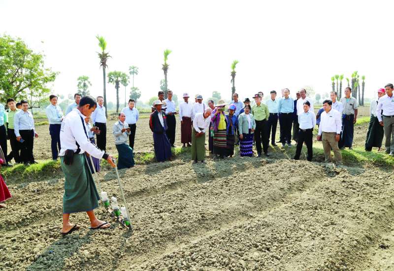 စိုက်ပျိုးရေး၊ မွေးမြူရေးနှင့် ဆည်မြောင်းဝန်ကြီးဌာန ပြည်ထောင်စုဝန်ကြီး ဦးမင်းနောင်သည် မန္တလေးတိုင်းဒေသကြီး သယံဇာတနှင့်ပတ်ဝန်းကျင် ထိန်းသိမ်းရေးဝန်ကြီး ဦးရွှေဇင်နှင့်အတူ ယမန်နေ့နံနက်ပိုင်းတွင် မိတ္ထီလာမြို့နယ် တောမအုပ်စုဥယျာဉ်ကျေးရွာရှိ မိတ္ထီလာတောင်ကန် ဥယျာဉ်မြောင်း ရေသောက်စနစ်အတွင်း နွေနှမ်း (ဆင်းရတနာ ၃) မျိုးများကို ပေါင်ကြီးတင်စနစ်ဖြင့် စိုက်ပျိုးထားသော တောင်သူများ၏ ဧက ၅၀ စံပြစိုက်ခင်းကို ကြည့်ရှုစစ်ဆေးသည်။