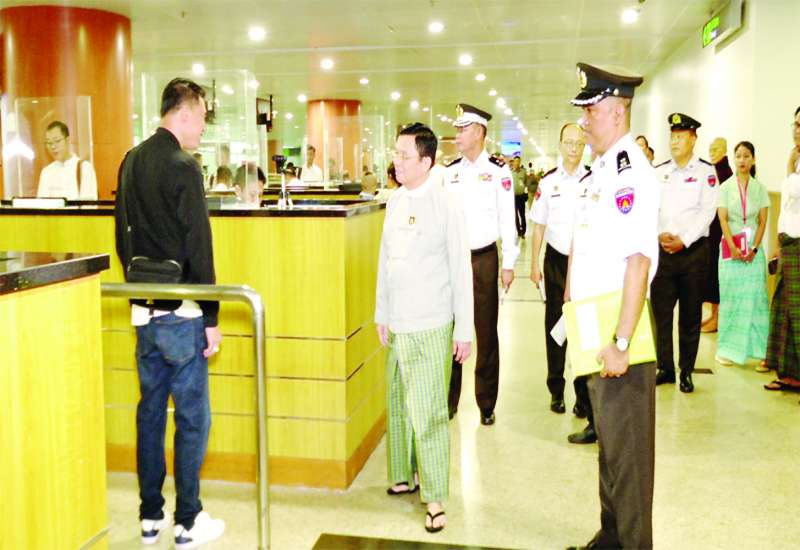 လူဝင်မှုကြီးကြပ်ရေးနှင့် ပြည်သူ့အင်အားဝန်ကြီးဌာန ပြည်ထောင်စုဝန်ကြီး ဦးမြင့်ကြိုင်သည် ယနေ့နံနက်ပိုင်းတွင် ရန်ကုန်အပြည်ပြည်ဆိုင်ရာလေဆိပ်သို့သွားရောက်၍ ပြည်ပထွက်ခွာမည့်ခရီးသည်များကို လူဝင်မှုကြီးကြပ်ရေးဆိုင်ရာလုပ်ငန်းများ စိစစ်ဆောင်ရွက်ပေးသည့် လေဆိပ် Terminal 1 မြေညီထပ် CIP Lounge ရှိ လူဝင်မှုကြီးကြပ်ရေး ကောင်တာများအား လေဆိပ်ပထမထပ် (Level-2) သို့ ပြောင်းရွှေ့နေရာချထားနိုင်ရေး ဆောင်ရွက်ထားရှိမှုအခြေအနေများကို လှည့်လည်ကြည့်ရှုစစ်ဆေးရာ လေဆိပ်တာဝန်ခံက လိုက်လံရှင်းလင်းတင်ပြသည်။