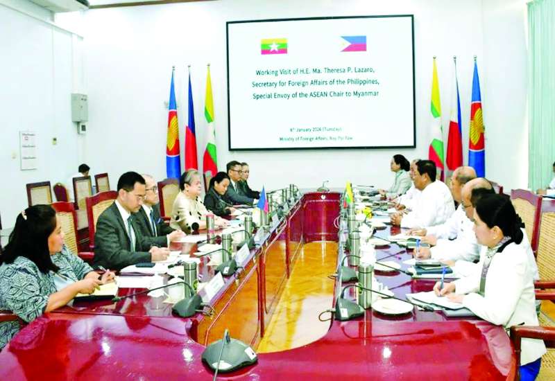 နိုင်ငံခြားရေးဝန်ကြီးဌာန ပြည်ထောင်စုဝန်ကြီး ဦးသန်းဆွေသည် ဇန်နဝါရီ ၅ ရက်မှ ၇ ရက်အထိ မြန်မာနိုင်ငံသို့ အလုပ်သဘောခရီးစဉ် လာရောက်သည့် အာဆီယံဥက္ကဋ္ဌ၏ မြန်မာနိုင်ငံဆိုင်ရာ အထူးကိုယ်စားလှယ် ဖိလစ်ပိုင်နိုင်ငံခြားရေးဝန်ကြီး H.E. Ms. Maria Theresa Parreno Lazaro ဦးဆောင်သည့် ကိုယ်စားလှယ်အဖွဲ့အား ယနေ့တွင်နေပြည်တော်ရှိ နိုင်ငံခြားရေးဝန်ကြီးဌာန၌ တွေ့ဆုံသည်။