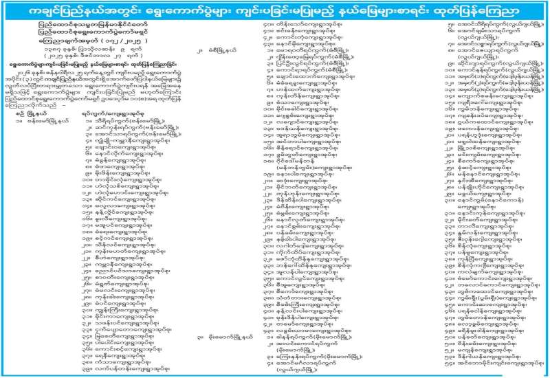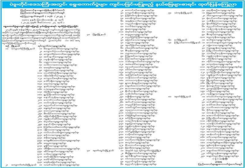 ရွေးကောက်ပွဲများကျင်းပခြင်းမပြုမည့် ပြည်သူ့လွှတ်တော်မဲဆန္ဒနယ်၊ အမျိုးသားလွှတ်တော်မဲအများဆုံးရသူ အနိုင်ယူစနစ် (FPTP) မဲဆန္ဒနယ်နှင့် တိုင်းဒေသကြီးလွှတ်တော် သို့မဟုတ် ပြည်နယ်လွှတ်တော် မဲအများဆုံးရသူ အနိုင်ယူစနစ်(FPTP) မဲဆန္ဒနယ်များစာရင်း ထုတ်ပြန်ကြေညာခြင်း
