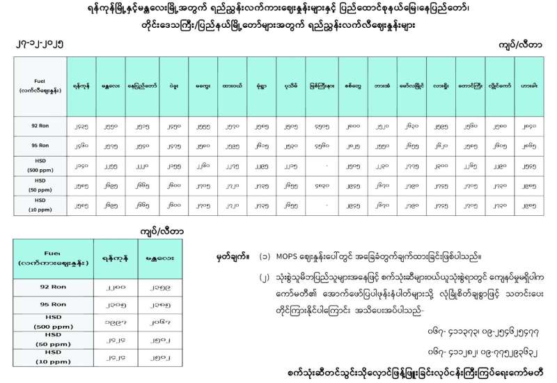 ရန်ကုန်မြို့နှင့် မန္တလေးမြို့အတွက် ရည်ညွှန်းလက်ကားဈေးနှုန်းများနှင့် ပြည်ထောင်စုနယ်မြေ နေပြည်တော်၊ တိုင်းဒေသကြီး/ ပြည်နယ် မြို့တော်များအတွက် ရည်ညွှန်းလက်လီဈေးနှုန်းများ