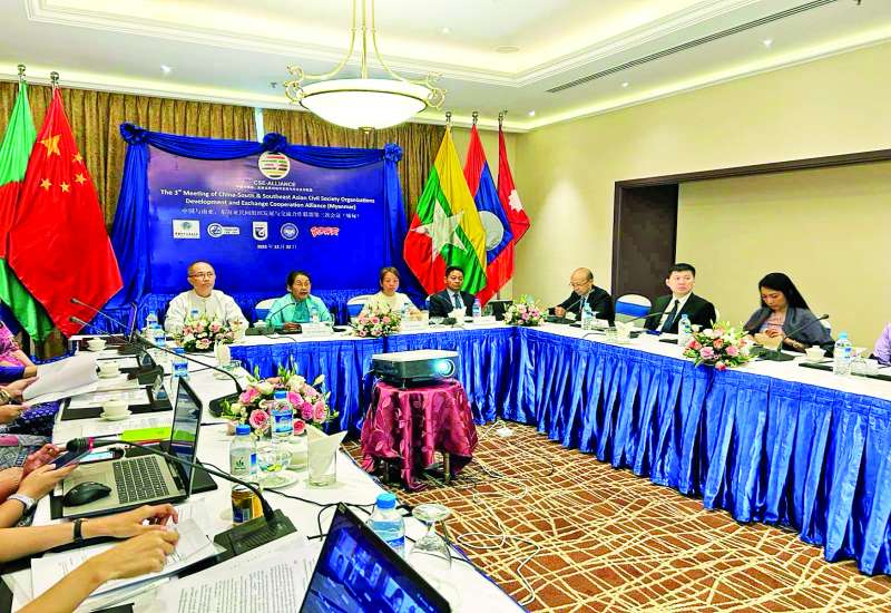 ဒေသတွင်း NGO အဖွဲ့အစည်းများ လူမှုဘဝတိုးတက်ဖွံ့ဖြိုးရေးလုပ်ငန်းများ ပူးပေါင်းဆောင်ရွက်ရန် မြန်မာ၊ တရုတ်၊ ဘင်္ဂလားဒေ့ရှ်၊ ကမ္ဘောဒီးယား၊ လာအို၊ နီပေါ(၆)နိုင်ငံမှ လူမှုရေး အသင်းအဖွဲ့များက ၂၀၂၅ ခုနှစ်အောက်တိုဘာ ၁ ရက်တွင် ကမ္ဘောဒီးယားနိုင်ငံ ဖနွမ်းပင်မြို့၌ စတင်ဖွဲ့စည်းခဲ့သည့် “တရုတ်-တောင်အာရှနှင့် အရှေ့တောင်အာရှ ပြည်သူ့လူမှုရေးအဖွဲ့အစည်းများ ဖွံ့ဖြိုးတိုးတက်ရေးနှင့် အပြန်အလှန် ပူးပေါင်းဆောင်ရွက်ရေးမဟာမိတ်အဖွဲ့ ”(China South & Southeast Asian Civil Society Organizations Development and Exchange Cooperation Alliance) ၏ တတိယအကြိမ်မြောက်ကျင်းပသည့် အွန်လိုင်းအစည်းအဝေးကို မြန်မာနိုင်ငံရှိ မြန်မာ-တရုတ် ပူးပေါင်းဆက်ဆံရေးအသင်းက စီစဉ်လျက် ဒီဇင်ဘာ ၂၂ ရက်တွင် ရန်ကုန်မြို့ ဆီဒိုးနားဟိုတယ်၌ အွန်လိုင်းစနစ်ဖြင့် ကျင်းပသည်။