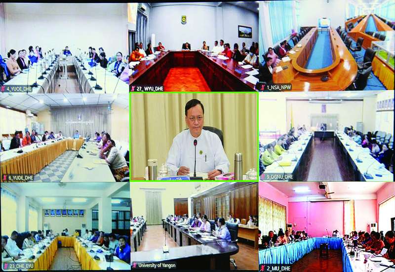 ပညာရေးဝန်ကြီးဌာန သိပ္ပံပွဲတော်အောင်မြင်စွာ ကျင်းပရေးနှင့် တက္ကသိုလ်ဝင် စာမေးပွဲမအောင်မြင်သည့် ကျောင်းသား ကျောင်းသူများအတွက် အလုပ်အကိုင်ရရှိရေး ကျွမ်းကျင်မှုဆိုင်ရာသင်တန်းများ ဖွင့်လှစ်နိုင်ရေး ညှိနှိုင်းဆွေးနွေးပွဲကို ယနေ့မွန်းလွဲပိုင်းတွင် နေပြည်တော်ပညာရေးဝန်ကြီးဌာန ရုံးအမှတ် (၁၃) ရှိ အစည်းအဝေးခန်းမ၌ ကျင်းပသည်။
