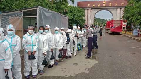 တရုတ်နိုင်ငံမှ ပြန်လည်၀င်ရောက်လာသည့် မြန်မာနိုင်ငံသားများအား ချင်းရွှေဟော်မြို့ တရုတ်-မြန်မာ နှစ်နိုင်ငံနယ်စပ်ဂိတ်တွင် ပြန်လည်လွှဲပြောင်းပေးအပ်